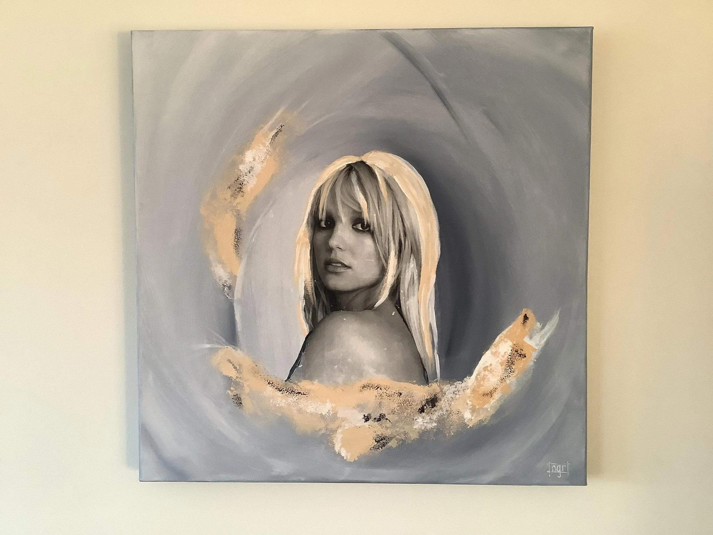 Dette er mitt første mixed media bilde. Jeg har overført fotografiet til lerretet, og senere malt på det. Britney Spears ble valgt fordi hun har en sterk historie. Akryl på bred blindramme, såkalt deep edge 3,7cm, måler 60 x 60. Alle kantene er malt, så det kan henges rett på vegg. SOLGT